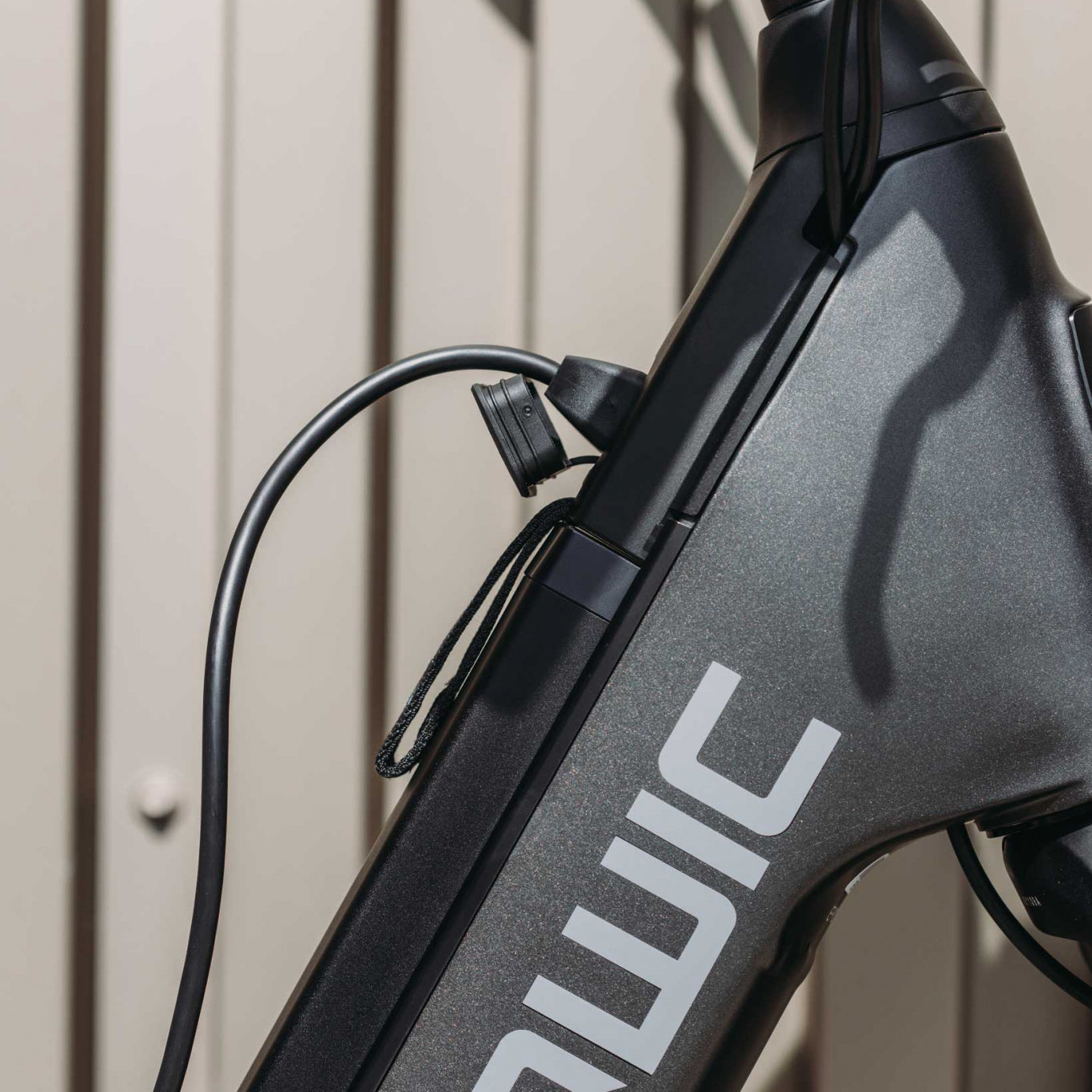 Het frame heeft een comfortabele lage instap. Je plaatst en verwijdert eenvoudig de accu dankzij het draaglusje.